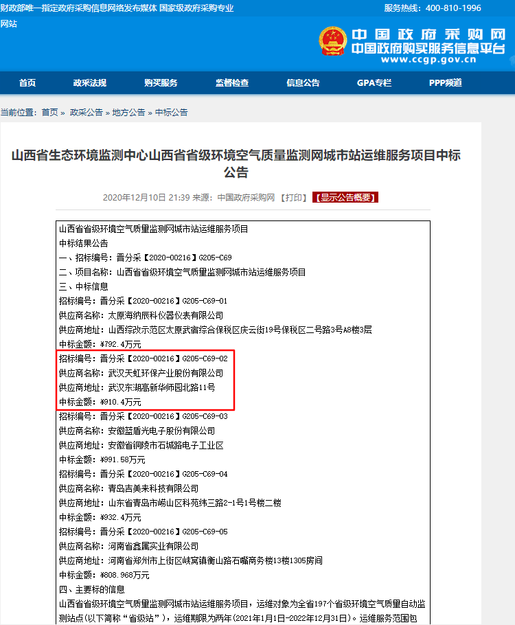 2020年12月10日,武漢天虹環(huán)保產(chǎn)業(yè)股份有限公司成功中標(biāo)“山西省省級環(huán)境空氣質(zhì)量監(jiān)測網(wǎng)城市站運維服務(wù)項目”(第2包),項目金額910.4萬元。運維服務(wù)城市包含忻州和呂梁20個縣(區(qū)、市)共計40個運維站點;運維服務(wù)范圍包括:各省級站所有監(jiān)測儀器(PM10、PM2.5、NOx、SO2、O3、CO)、氣象儀器、質(zhì)控設(shè)備(零氣發(fā)生器、動態(tài)校準(zhǔn)儀)、數(shù)據(jù)采集與傳輸設(shè)備、輔助設(shè)備、防雷、消防等基礎(chǔ)設(shè)施的日常維護、質(zhì)量控制、故障維修、年度檢修、檢定等工作,以及站房租賃與維護、站房運行電費、視頻監(jiān)控、網(wǎng)絡(luò)通訊保障,并負擔(dān)相應(yīng)費用,并須接受山西省生態(tài)環(huán)境廳和山西省生態(tài)環(huán)境監(jiān)測中心的質(zhì)控檢查和考核,確保省級站各項監(jiān)測儀器正常穩(wěn)定運行并與省、市、縣環(huán)保部門聯(lián)網(wǎng)正常;運維服務(wù)期2年。